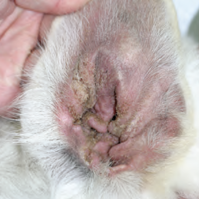 Infected skin can show hotspots, pimples, crust, hair loss and can be greasy and/or smelly.